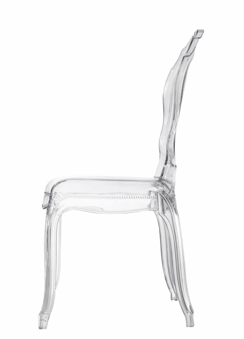 Do Eleganckiego Salonu: Bogate barkowe zdobienia i przezroczysta forma sprawiają, że krzesło jest świetną dekoracją, jednocześnie optycznie nie zabiera przestrzeni.