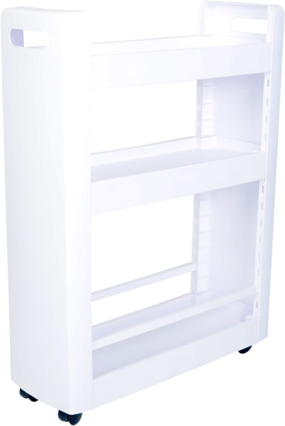 Kuchni: Perfekcyjnie wpasuje się między szafki lub pod stół, oferując miejsce na przyprawy, butelki, puszki czy książki kucharskie, zapewniając łatwy dostęp podczas gotowania.